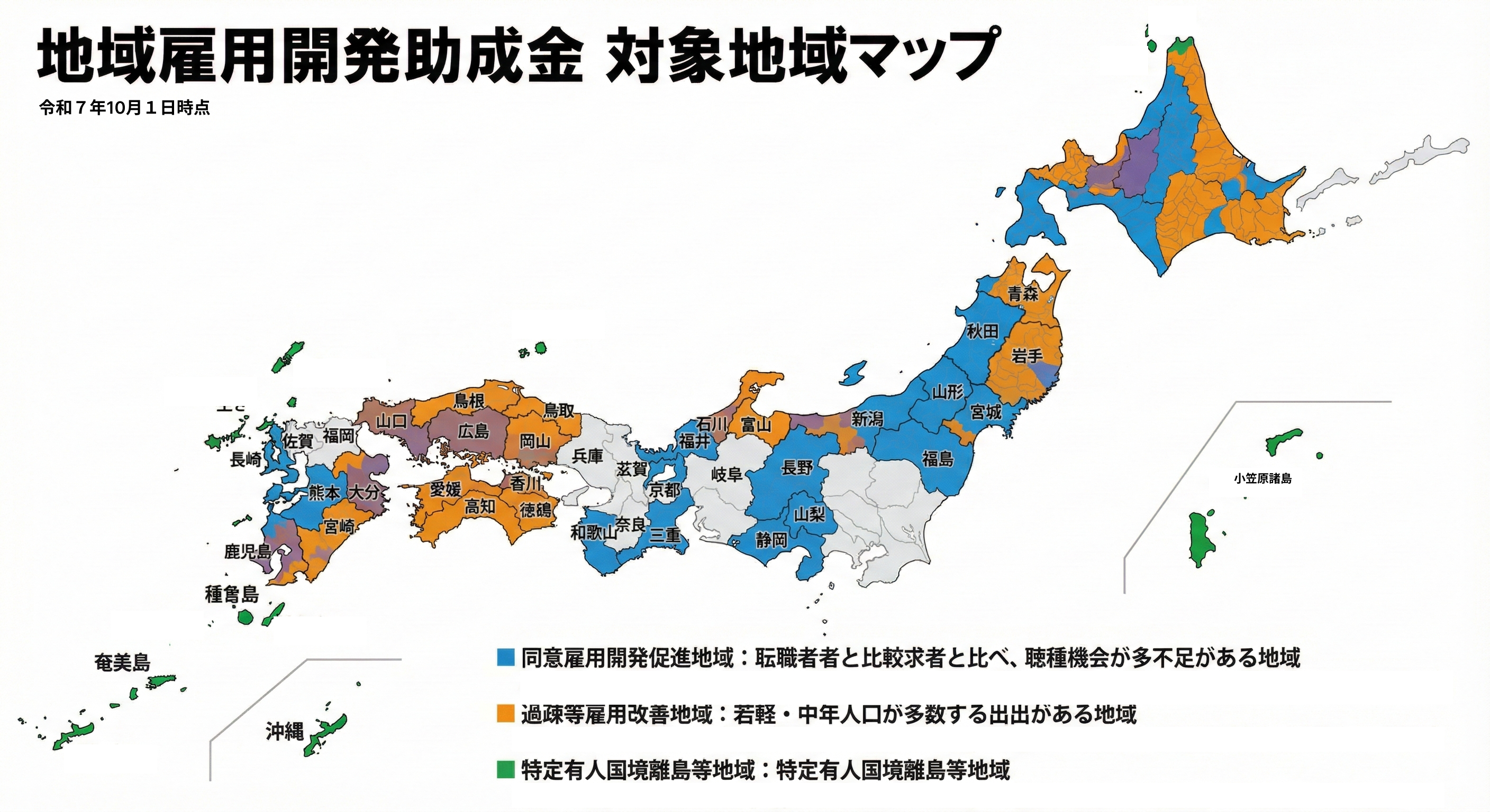 地域雇用開発助成金(地域雇用開発コース)では、雇用情勢の厳しい地域等で事業所を整備し、求職者を雇い入れる事業者が支援されます。「雇用情勢の厳しい地域等」とは、以下の地域を指します。