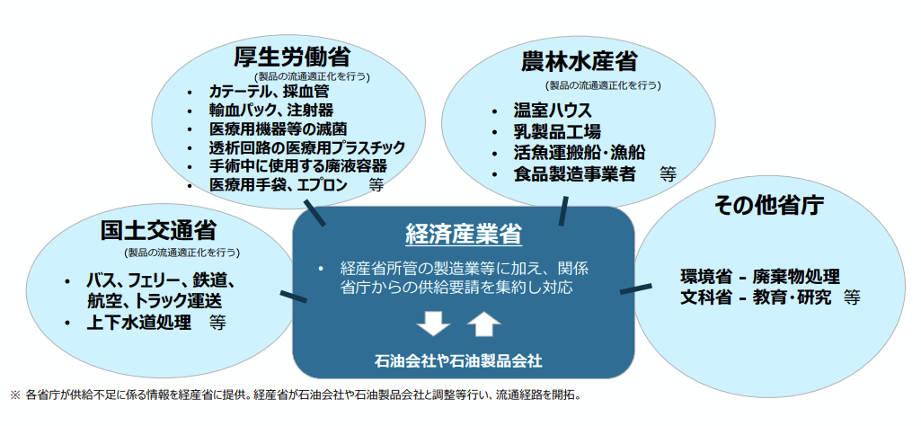 経済産業省が燃料・化学製品の供給に関する相談窓口を設置しています。国土交通省管轄の輸送事業者(トラック・バス・旅客船など)は国土交通省、農業・水産業・食品製造は農林水産省にも相談窓口があります。流通の目詰まりが生じている場合、関係省庁が連携して個別に対応する体制が整っています。まずは業種に応じた省庁または地方経済産業局に連絡してみてください。