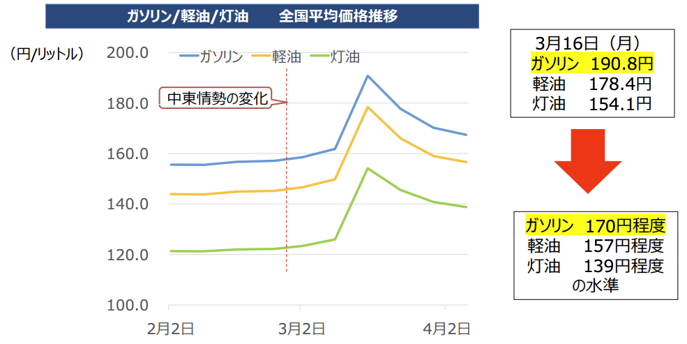 経済産業省の資料によると、3月16日(月)にガソリン190.8円、軽油178.4円を記録した後、3月19日から緊急的な激変緩和措置を開始。ガソリン170円程度、軽油157円程度、灯油139円程度の水準への抑制を実現しました。