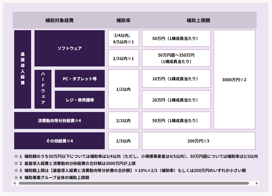 | ソフトウェア購入費・導入関連費 | ~50万円 | 3/4以内 (小規模事業者は4/5以内) |