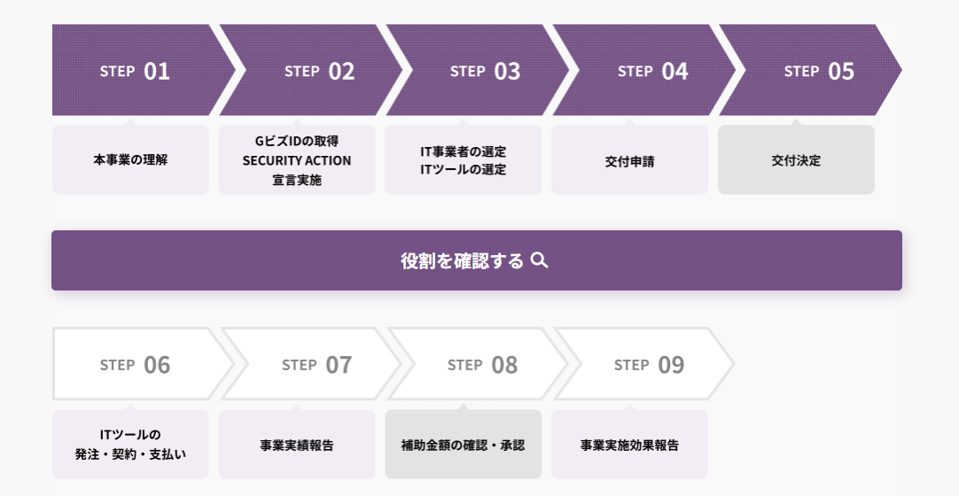 | ①公募要領等確認 | 公式サイトや公募要領等を見て、導入したいツールがどの申請枠に該当するか確認 |