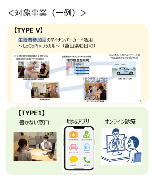 デジタルを活用した地域の課題解決や、魅力向上を目指す取組が支援されます。「TYPE1」「TYPEV」「TYPES」の3つの区分があり、具体的な事例としては地域アプリやオンライン検診、マイナンバーカードを活用した見守り生活者参加型システム等が挙げられます。