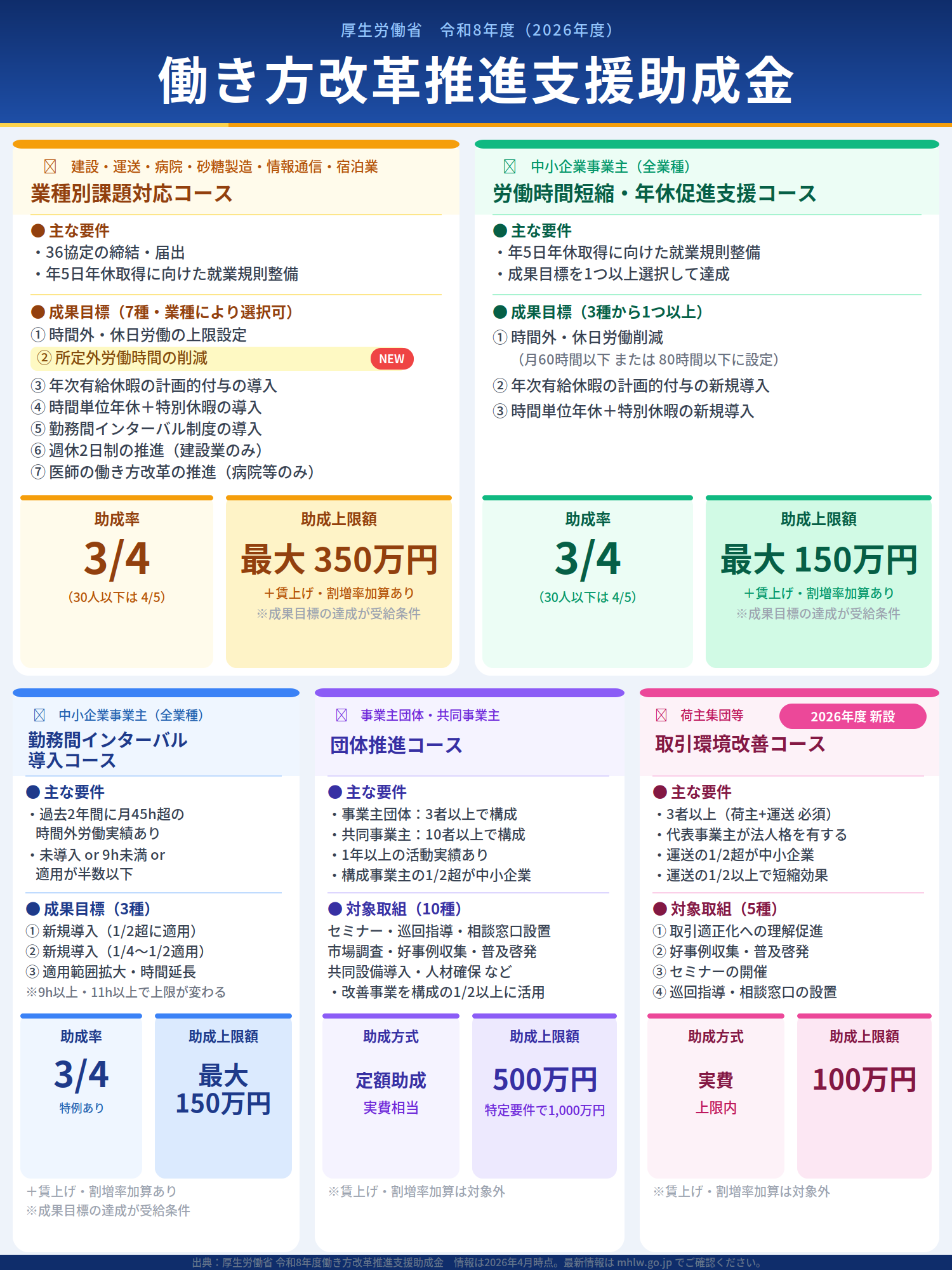 | 労働時間短縮・年休促進支援コース | 全業種の中小企業事業主 | 最大150万円+賃上げ加算 | 令和8年11月30日(月) |