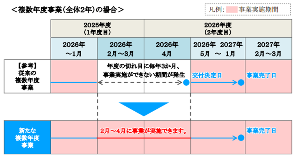 本事業は、複数年度事業の申請が可能です。年度の切れ目なく事業を実施できるので、長期的な事業も対象となります。