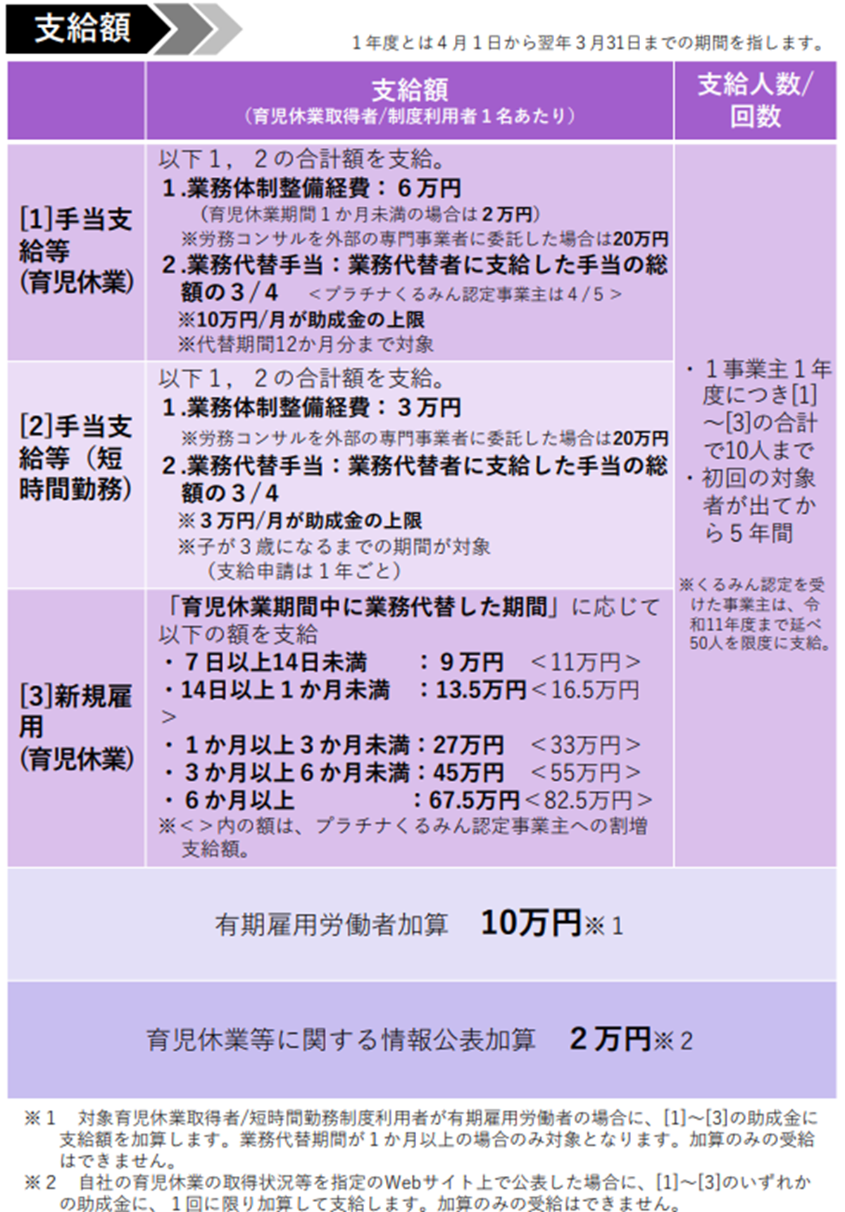 なお「業務体制整備経費」は、労務コンサルを外部の専門事業者に委託した場合は20万円、育児休業期間1か月未満の場合は2万円となります。
