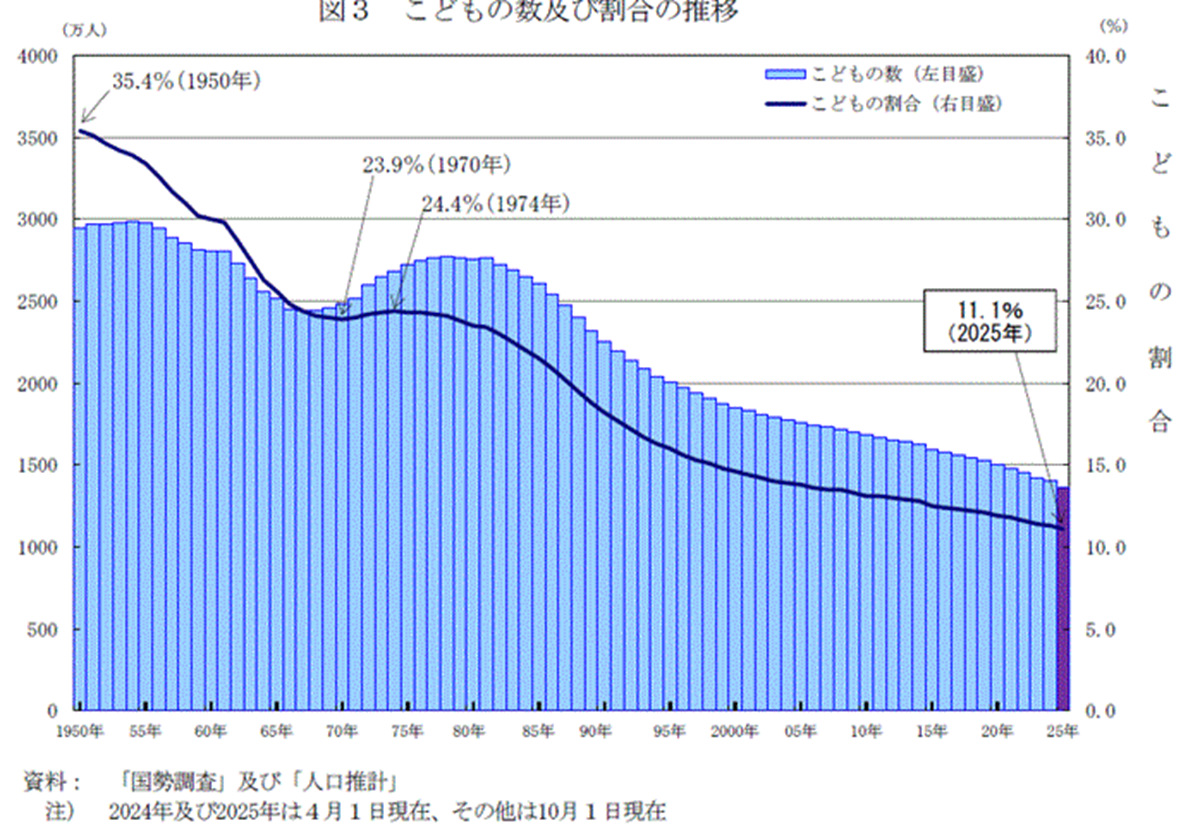 総務省の発表によると、令和6(2025)年4月1日、こどもの数は1,366万人となりました。これは前年度に比べて35万人の減少です。子どもの数は44年連続で減少となりました。