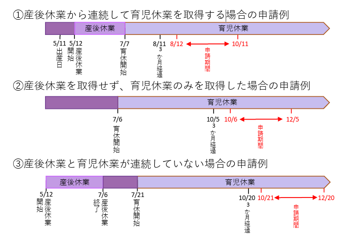 それぞれのパターンの申請タイミングのイメージは、以下のようになります。
