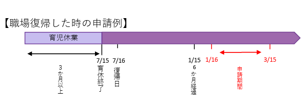 職場復帰時の助成金は、育児休業の終了後6か月経った翌日から2か月以内に申請が必要です。申請タイミングのイメージは、以下のようになります。