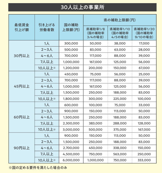 本奨励金の補助率は、国が実施する業務改善助成金の、自己負担分の1/2となります。具体的には以下の表のとおりです。【令和7年度に国助成金交付申請をする場合】