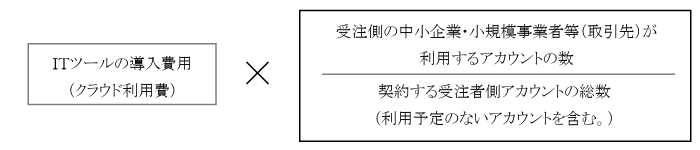 ITツールのクラウド利用費を、利用予定のないアカウントを含めた受注者アカウントの総数で割り算し、取引先が実際に利用するアカウント数で乗じた金額が補助対象経費となります。