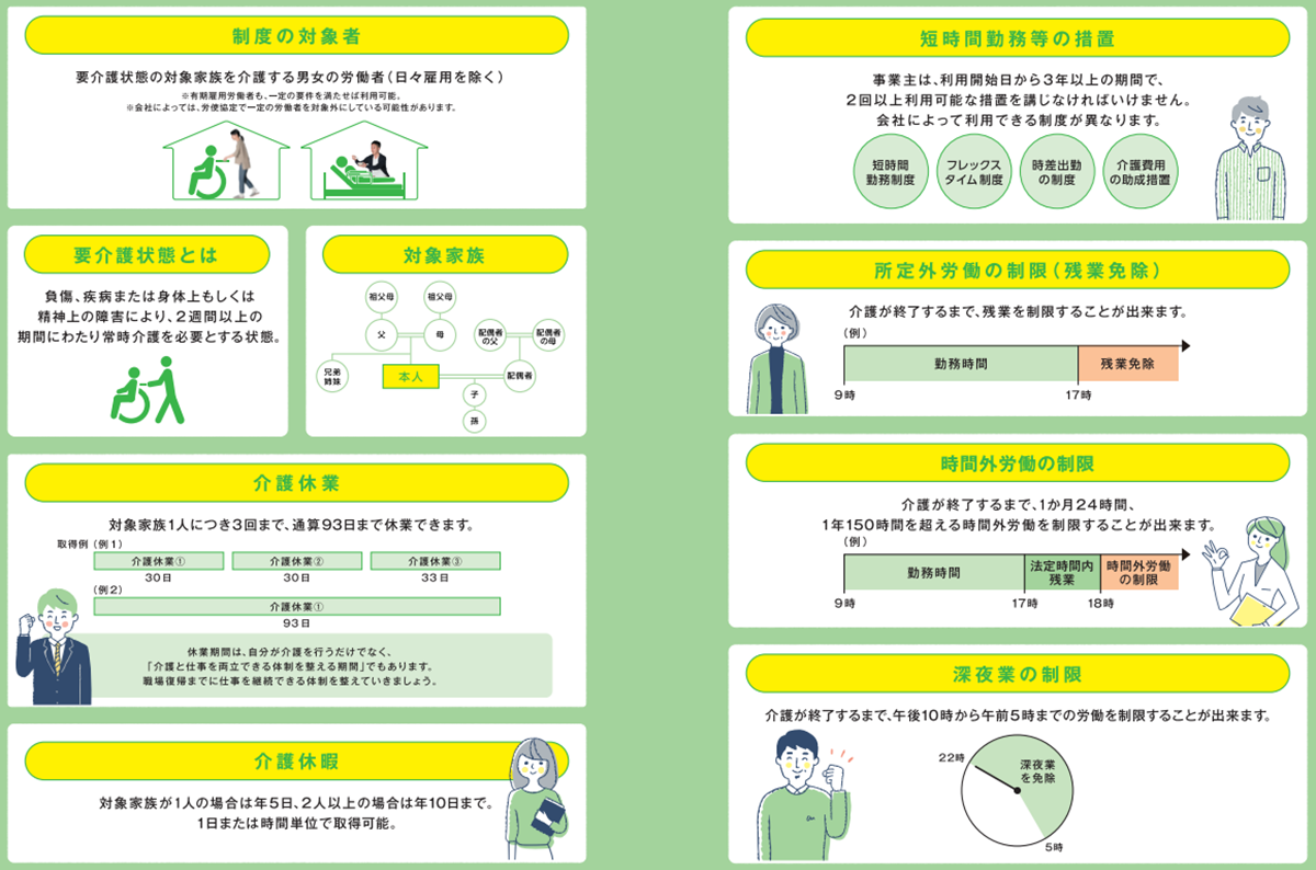 介護休業制度は、介護休暇・休業を含む、家族の介護を行う労働者のための制度です。短時間勤務等の措置や所定外労働の制限なども定められています。