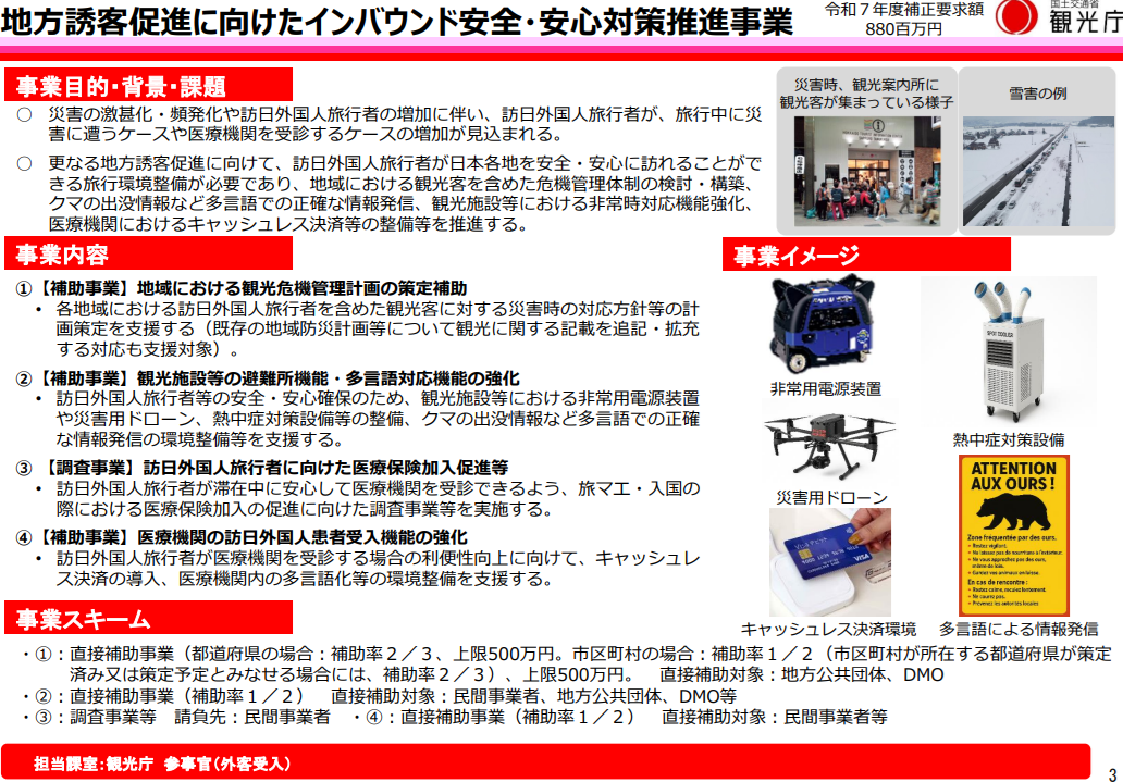 非常用電源装置や災害用ドローン、熱中症対策設備の整備に加え、クマの出没情報などを多言語で発信できる環境づくりを支援し、施設の安全性向上と外国人旅行者の安心につながる体制を整えます。