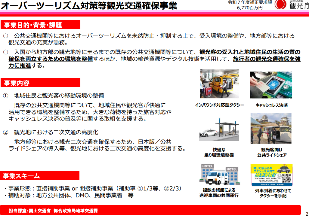 観光客と地域住民の双方が快適に移動できるよう、空港から地方観光地までの公共交通や二次交通をデジタル技術などで改善し、混雑の未然防止と観光交通の確保を進める事業です。