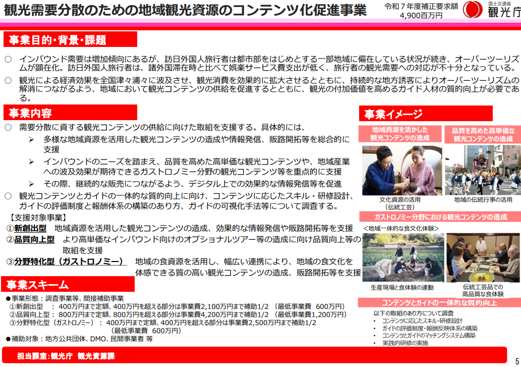 観光需要分散のための地域観光資源のコンテンツ化促進事業(49億円)