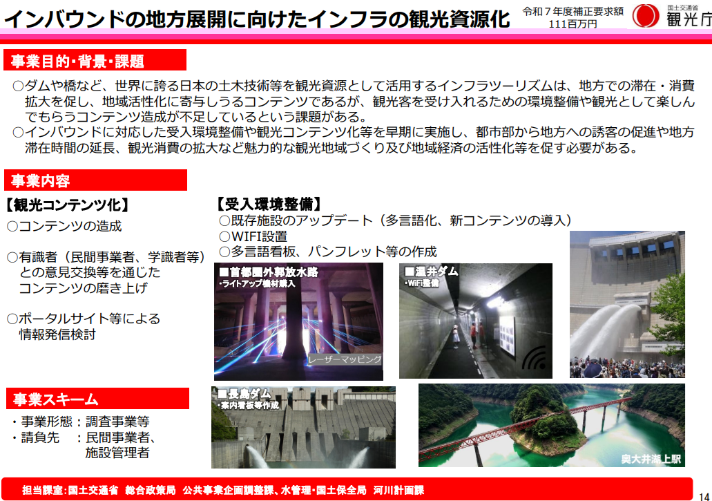 日本のダムや橋などの土木技術は国際的にも評価が高く、観光資源として活用することで地方での滞在や消費を促す可能性があります。しかし、観光客を受け入れるための環境整備や、観光として楽しんでもらうためのコンテンツが十分ではないことが課題となっています。こうした状況を踏まえ、本事業ではインバウンド対応を含む受入環境の整備を早期に進め、都市部から地方への誘客、滞在時間の延長、観光消費の拡大につながる魅力的な観光地域づくりを後押しします。