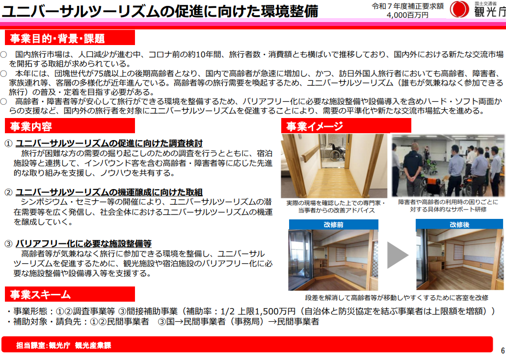 国内外の旅行者層が多様化する中で、高齢者や障害のある方、家族連れなど、誰もが安心して旅行できる環境づくりが重要になっています。旅行需要が横ばいで推移する国内市場においても、新たな交流を生み出すにはユニバーサルツーリズムの普及が欠かせません。こうした背景から、観光施設や宿泊施設のバリアフリー化や、受入体制の強化を支援する取り組みが進められています。