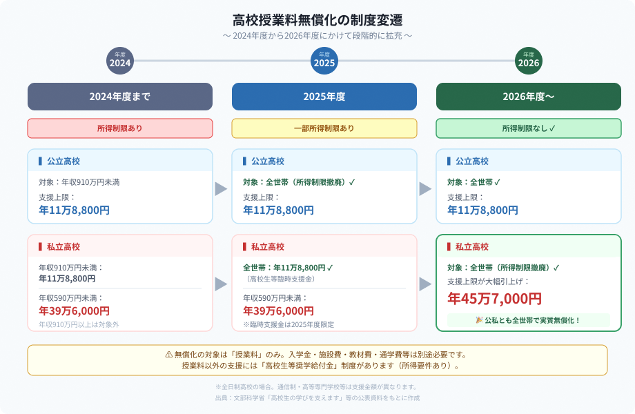 このように、2025年から2026年にかけて「所得制限の撤廃」に向けた動きが段階的に進んでいます。2025年度は臨時的な支援措置、2026年度からは恒久的な制度として、すべての高校生が授業料支援を受けられる環境が整っていく予定です。