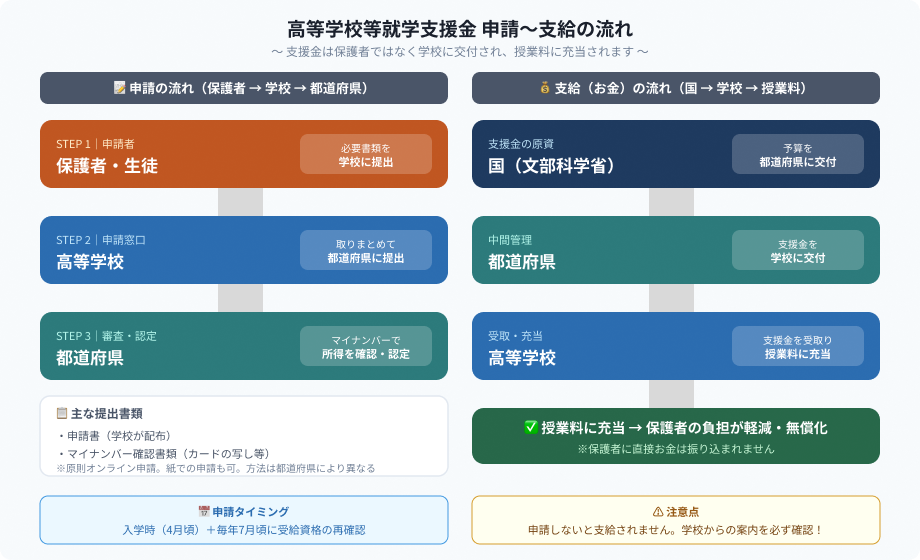 | 4 | 支援金が学校に交付される | ・支給が決定すると、国が都道府県を通じて学校へ支援金を交付 ・基本的には学校がその金額を授業料に充てる(保護者は直接お金を受け取らない) ※支援金の扱いには例外あり |