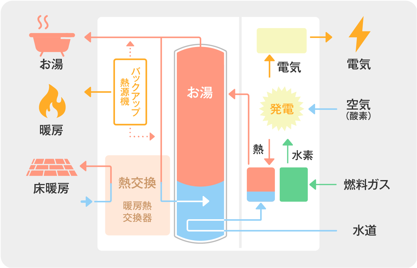 エネファーム(家庭用燃料電池)は、都市ガスやLPガスなどから水素を作り、その水素と空気中の酸素の化学反応により発電するものです。エネルギーを燃やさずに直接利⽤するため、⾼い発電効率が得られます。また、発電時に発生する排熱を回収し、給湯器の役割も果たします。