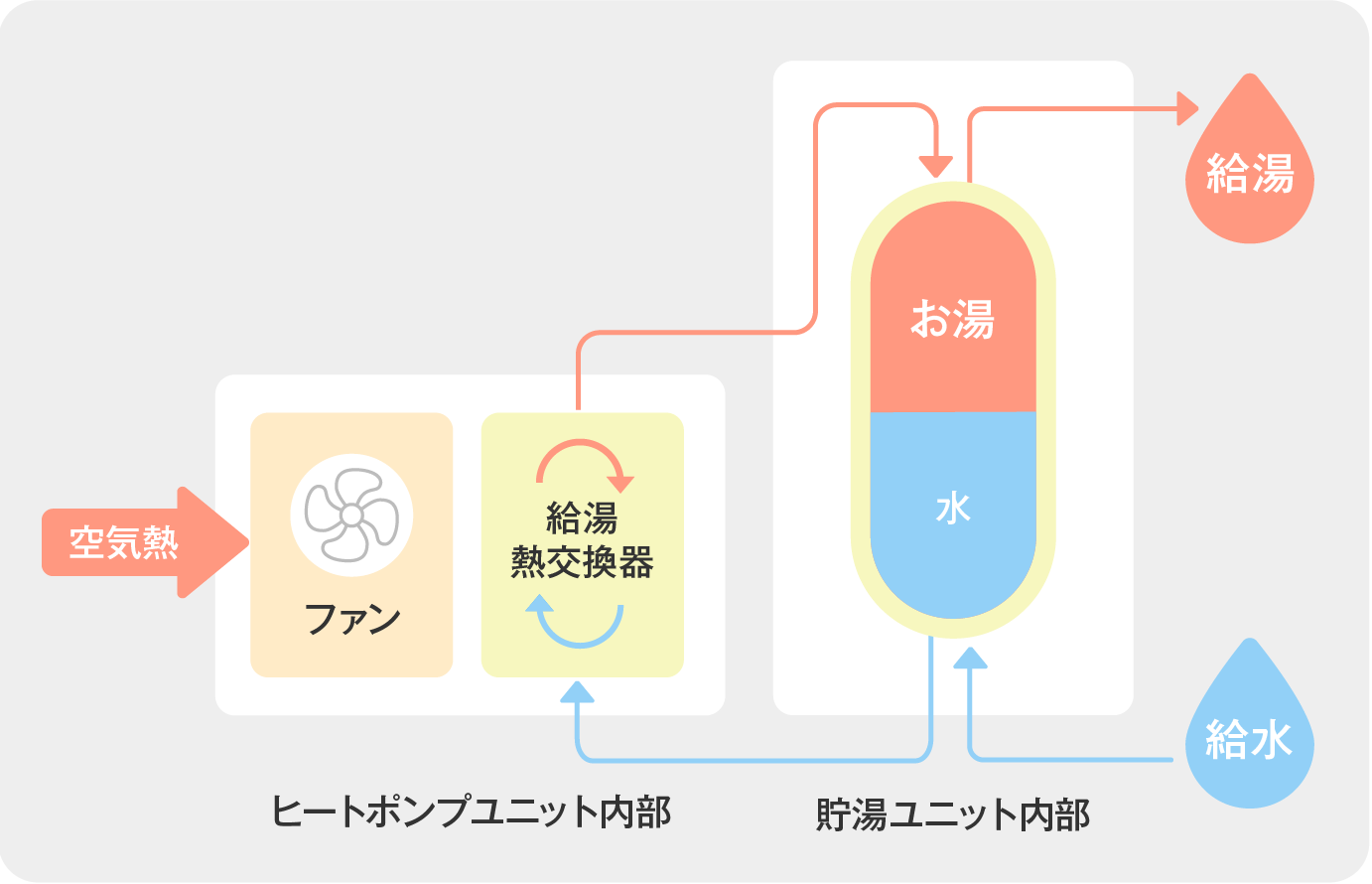 エコキュート(ヒートポンプ給湯機)は、ヒートポンプの原理を⽤い、夜間電力や太陽光で発電した電力を有効利用できる給湯器です。冷媒の圧縮・膨張サイクルでお湯を作り、作ったお湯を貯湯タンクに備えることで、必要なときにいつでもお湯が使えます。