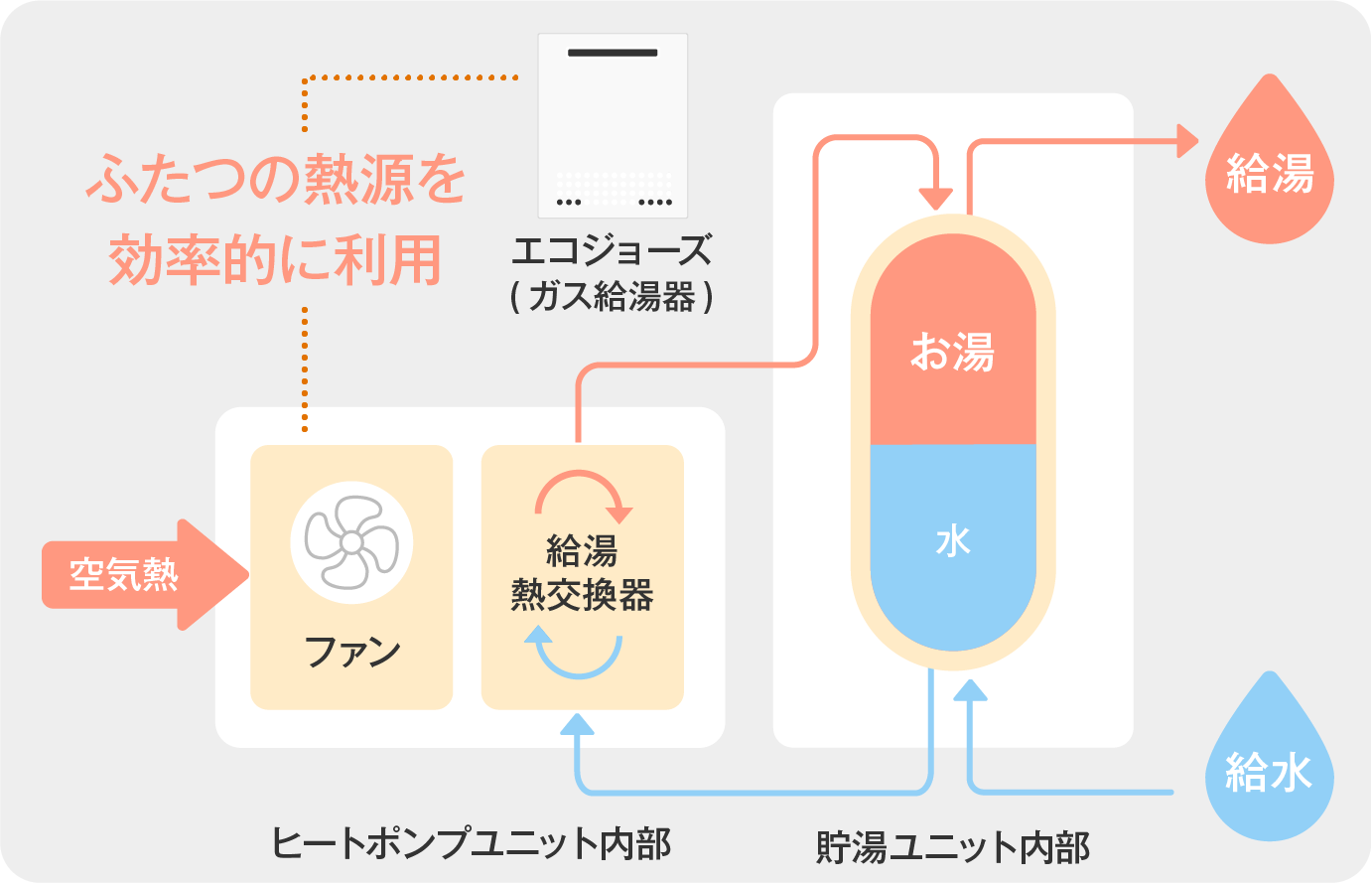 ハイブリッド給湯機(電気ヒートポンプ・ガス瞬間式併用型給湯機)は、ヒートポンプ給湯機とガス温水機器を組み合わせた機器です。2つの熱源を効率的に⽤いて、エコキュートより⾼効率な給湯が可能となります。