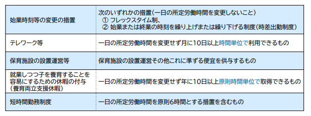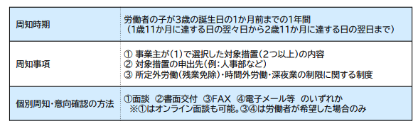 また、対象となる従業員には「制度の内容」「申出先」「残業免除や時間外労働・深夜業の制限制度」について、子が3歳になる前の1年間に個別の周知と意向確認を行うことも義務づけられます。