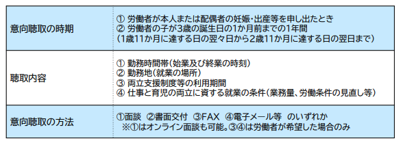 また、妊娠・出産等の申出時と子が3歳になる前の個別の意向聴取の時期と確認内容および方法は以下の通りです。