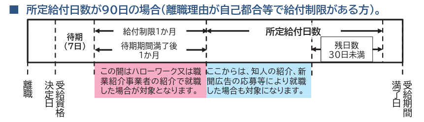 自己都合等により退職した人は、待期期間満了後1か月間は、ハローワーク等の紹介によって就職した場合のみ再就職手当の支給対象となります。詳しくは以下の図をご覧ください。