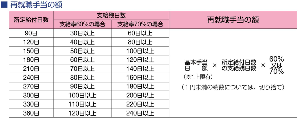 所定給付日数の1/3以上を残して就職した場合は支給残日数の60%、所定給付日数の2/3以上を残していた場合は支給残日数の70%を、それぞれ基本手当日額に乗じた額が支給されます。