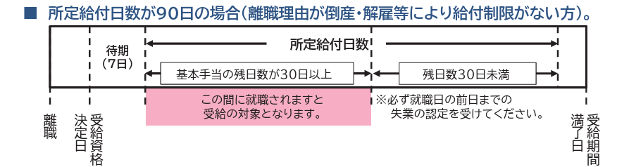 所定給付日数が90日の場合、1/3である30日間以上残っている時点で再就職すると、再就職手当の対象となります。支給残日数が多いほど、受け取れる再就職手当の額が増えるため、可能な限り早めの再就職がおすすめです。