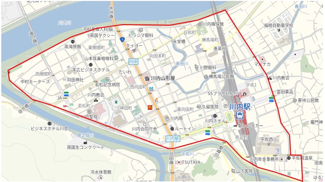 本補助金の対象となるのは、中心市街地内の道路に面している空き店舗を改修して新規出店する事業者です。「中心市街地」の区域は、以下の地図を参考にしてください。