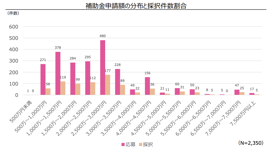補助金申請額は、2,000万以上~2,500万未満が763件と最も多く、次いで1,000万以上~1,500万未満、500万以上~1,000万未満という結果でした。申請金額ごとの採択率は以下のとおりです。