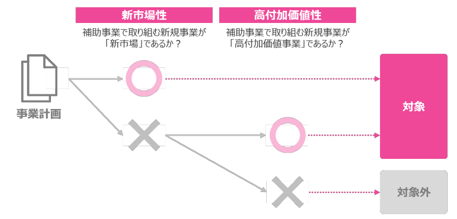 本項目のイメージとしては、まず新市場性の有無が審査され、該当しない場合でも高付加価値性が認められれば、補助対象となる仕組みです。つまり、新市場性と高付加価値性のどちらかを満たしている必要があります。