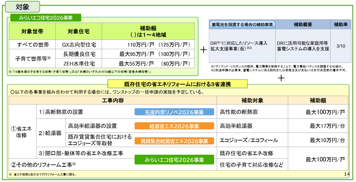 また、家庭向けの省エネ住宅支援については、住宅省エネキャンペーンの一環として新たに「みらいエコ住宅2026事業」が実施予定です。