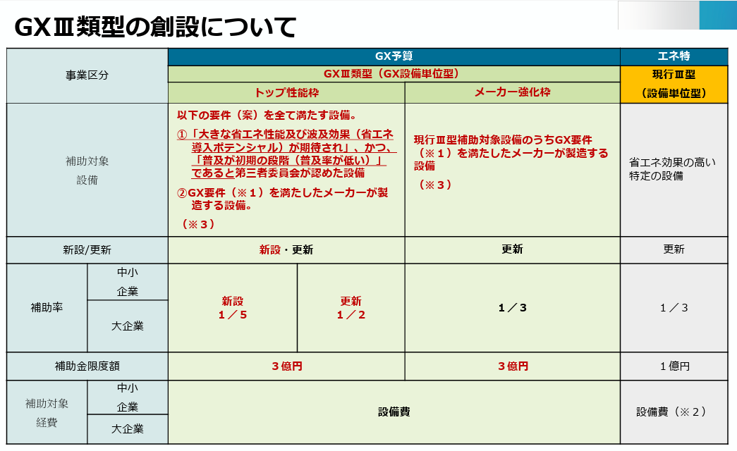 新たに創設予定のGXⅢ類型では、メーカー強化枠とトップ性能枠が設けられ、補助率や上限額は以下のように提示されています。