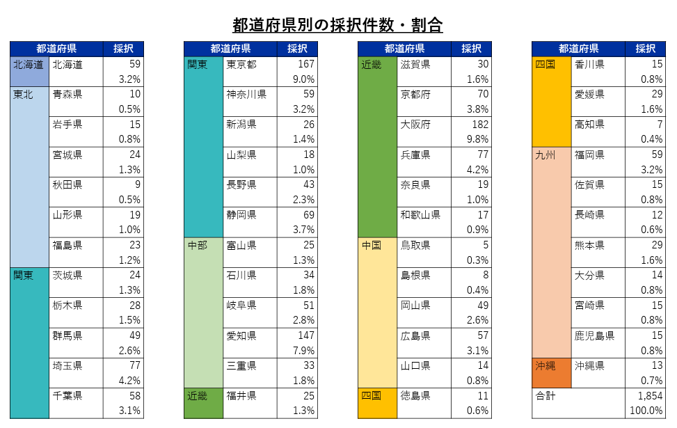 すべての都道府県で採択事例がありましたが、特に大阪府・愛知県・東京都が多い傾向でした。大阪府・愛知県・東京都は事業者数が多く、製造業も多いためだと考えられます。