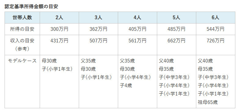 | 世帯人数 | 世帯構成/住宅状況 | 世帯全体の所得金額(目安) |