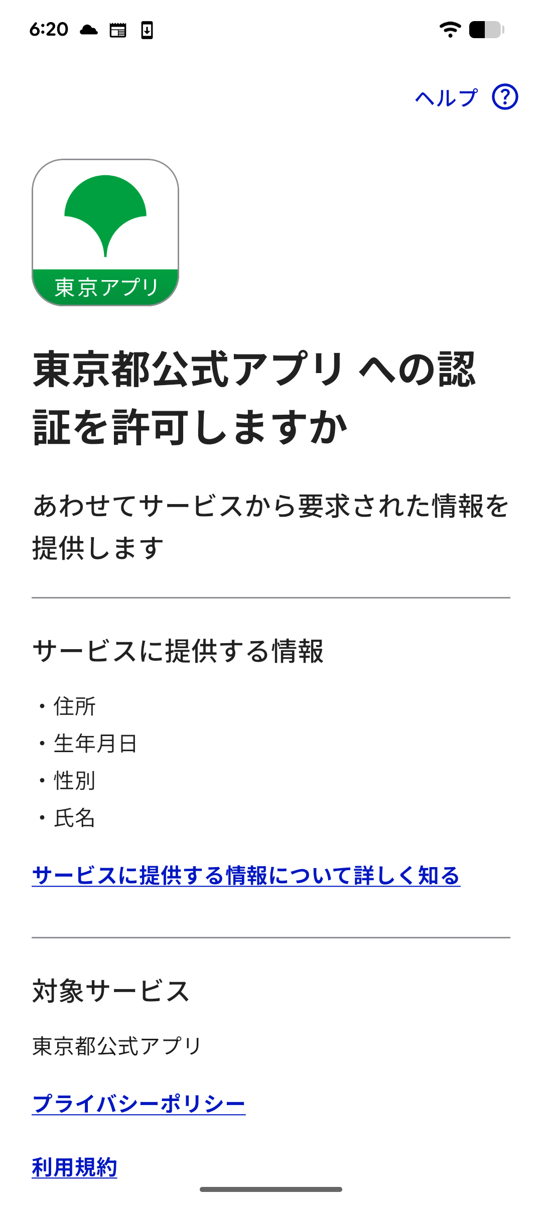 マイナンバーカードの読み取りが完了すると、東京アプリで本人確認を進めるために、認証の許可や情報提供について確認する画面が表示されます。