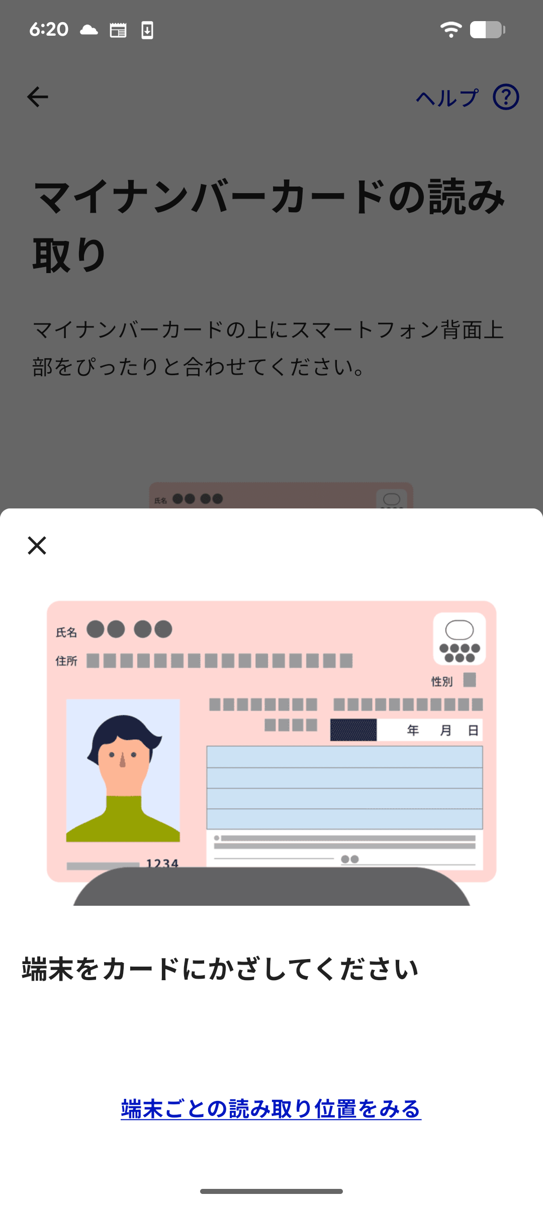 「読み取り開始」ボタンを押し、マイナンバーカードにスマートフォンをかざします。