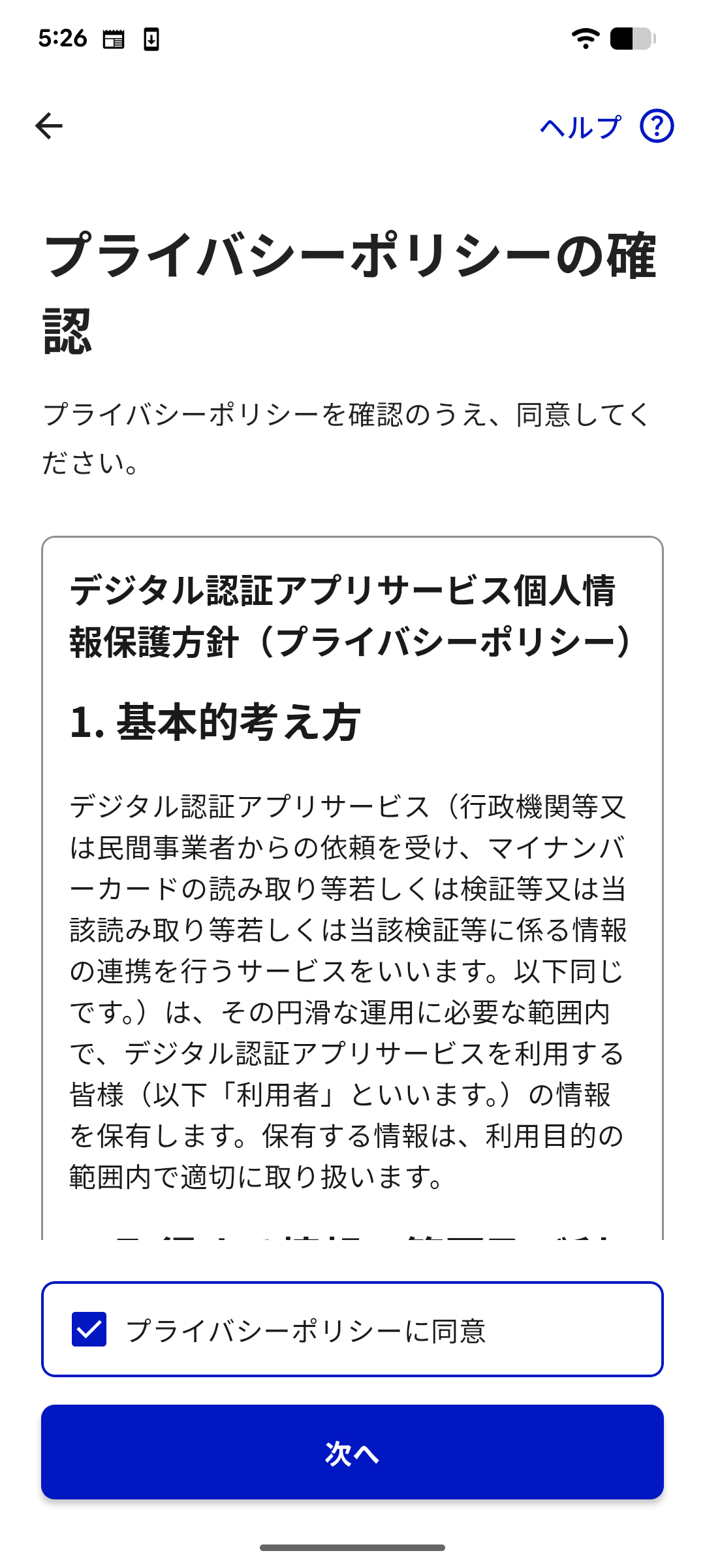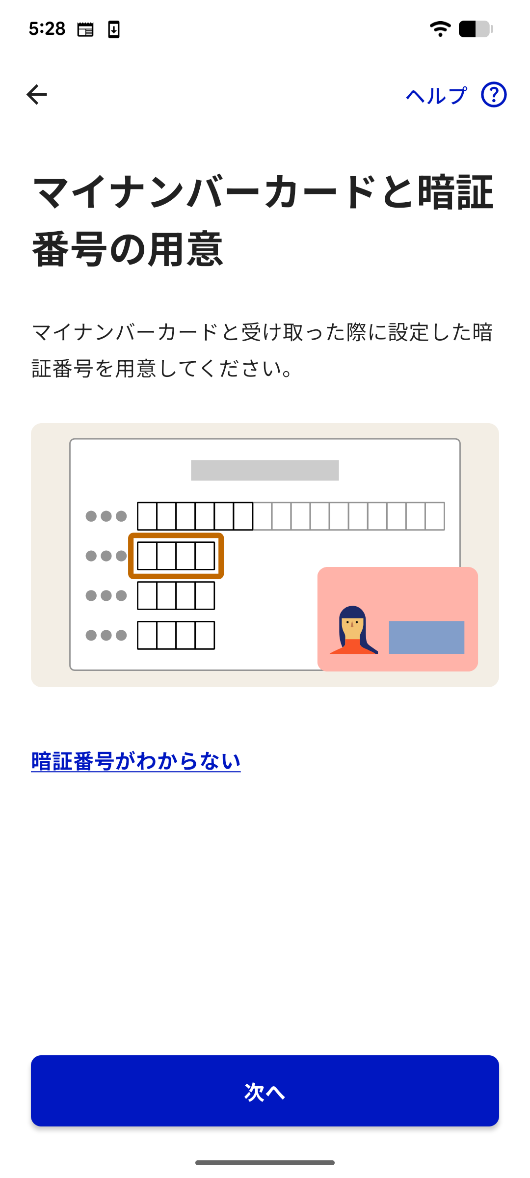 本人確認の手順を確認して「次へ」を押すと、「マイナンバーカードで本人確認」という画面が表示されます。