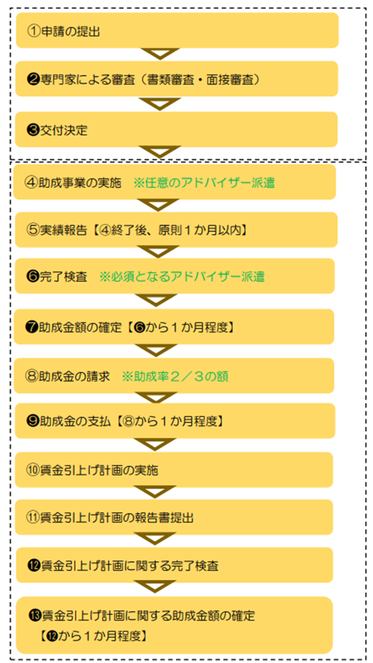 その後、アドバイザーの派遣と完了報告があり、助成金額の確定となります。
