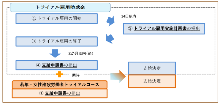 参考:トライアル雇用助成金(若年・女性建設労働者トライアルコース)